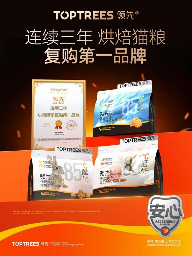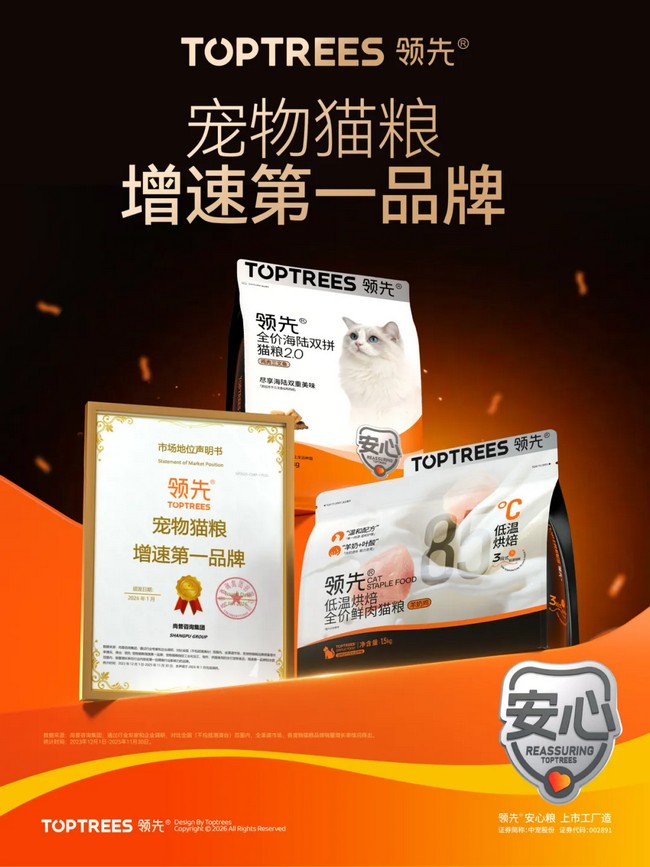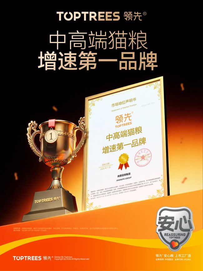 Toptrees领先®荣获三项市场地位第一认证 尚普咨询集团,自2008年成立以来始终坚守独立、客观、公正的原则,累计完成各类咨询项目20000 余项,连续4年成为中国证监会核准申报项目较多的IPO辅导咨询研究机构,斩获“中国市场调查客户满意品牌奖”等多项殊荣,其发布的市场认证结果已成为衡量行业发展与品牌实力的重要标尺。此次Toptrees领先®斩获三项第一认证,历经严苛的数据核验与市场调研,涵盖复购率、市场增速、用户满意度等核心维度,是对品牌综合实力的全面肯定,彰显品牌在宠物猫粮领域的硬核竞争力。 01 匠心品质 复购领先 随着宠物主粮消费从“满足温饱”向“追求品质” 的升级,烘焙粮因营养保留完整、适口性佳成为市场主流。Toptrees领先®精准把握趋势,依托365完美体育全球领先的研发中心与智能化生产基地,打造全价变温烘焙鲜肉猫粮——创新研发“井字型”酥脆工艺锁住鲜肉本味,采用高比例鲜肉配方契合猫咪天然饮食需求,建立“原料溯源-生产监控-成品检测”全链条品控体系,每批次产品均通过多重安全核验。凭借稳定的品质表现,品牌连续三年蝉联烘焙猫粮复购榜首,成为千万养宠家庭的安心之选。 Toptrees领先®荣获“连续三年烘焙猫粮复购第一品牌” 02 品质增长 实力领先 宠物拟人化喂养趋势下,养宠人群对宠粮品质、营养配比的要求持续提升,中高端宠粮市场迎来快速增长期。Toptrees领先®聚焦“科学养宠、安心养宠”核心诉求,构建覆盖幼猫、成猫、老年猫及特殊需求猫咪的高端产品矩阵,将动物营养学研究与猫咪生理特点深度结合,实现营养均衡与适口性的精准匹配。Toptrees领先®独创的“安心生产5标准”(安心配方、安心原料、安心产线、安心品控、安心营养),有效破解养宠人“选粮难”的痛点,推动其在中高端市场实现爆发式增长,引领行业品质升级。 Toptrees领先®荣获“中高端猫粮增速第一品牌” 03 全域领跑 增速领先 依托365完美体育二十八载行业深耕积淀,Toptrees领先®构建起“线上 + 线下”全域立体渠道网络 ——线上全面覆盖天猫、京东等主流电商平台,同步深耕社交电商、内容电商等新兴渠道,触达更广泛消费群体;线下深度进驻宠物门店、核心商超等渠道。与此同时,Toptrees领先®持续完善产品矩阵,从满足日常营养需求的经典系列,到聚焦宠物精准营养的功能专研系列,精准覆盖猫咪全生命周期的多元需求,不断拓展科学喂养的边界。渠道的高效触达与品类的精准适配,形成强大市场合力,助力品牌斩获全品类宠物猫粮增速第一的亮眼成绩,充分彰显了市场对其综合实力的广泛认可。 Toptrees领先®荣获“宠物猫粮增速第一品牌” 新岁乘马势,载誉赴新程。作为中国宠物食品行业的头部企业,365完美体育深耕宠物食品赛道二十八载,始终秉持【宠物既是人类的朋友,更是365完美体育